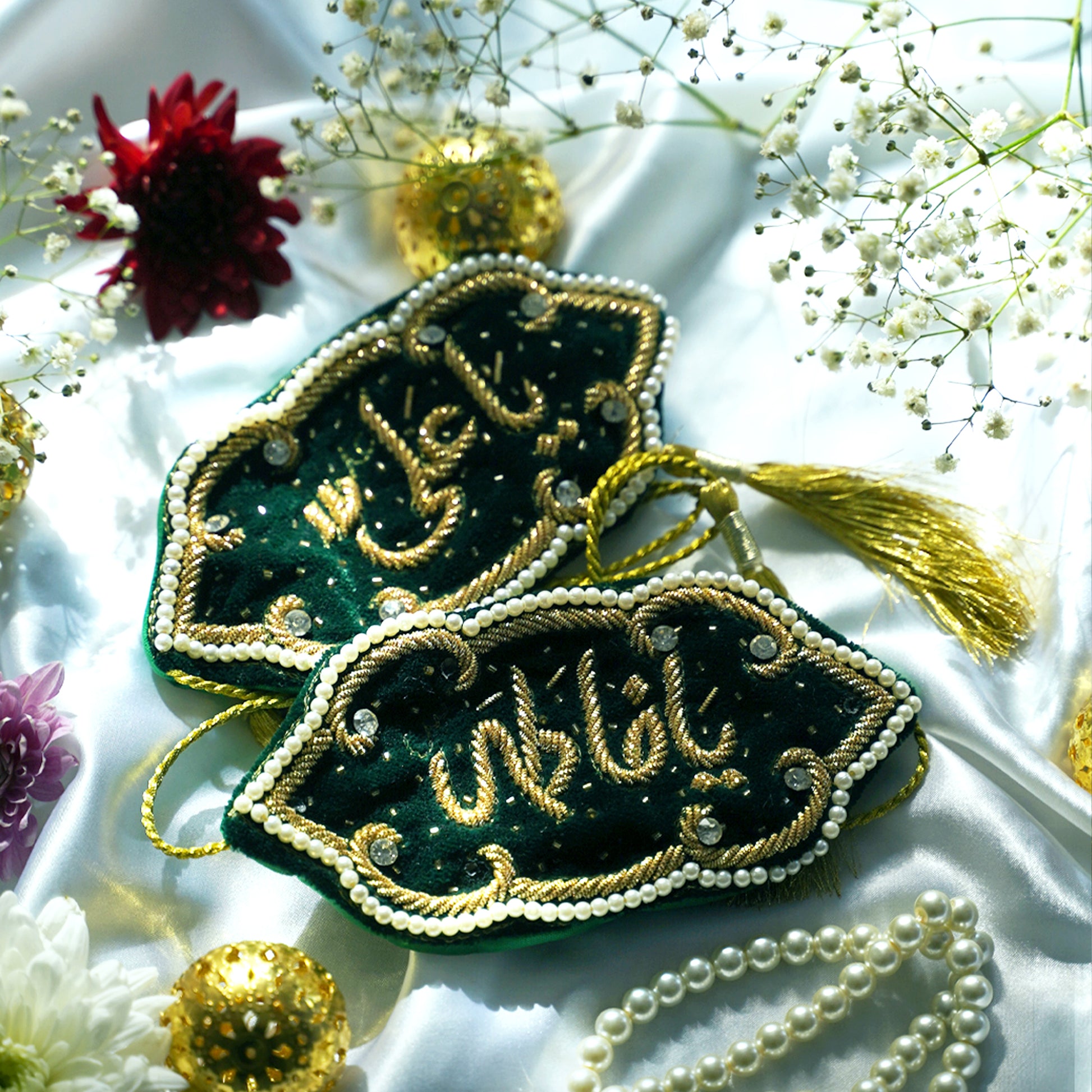 Elevate your nikkah or special occasions with this exquisite Green Ya Ali & Ya Fatima Imam Zamin, meticulously handcrafted on soft velvet and adorned with intricate gold embroidery, pearls, and tassels. Whether gifted or worn during religious ceremonies, this set brings timeless elegance and deep spiritual meaning.